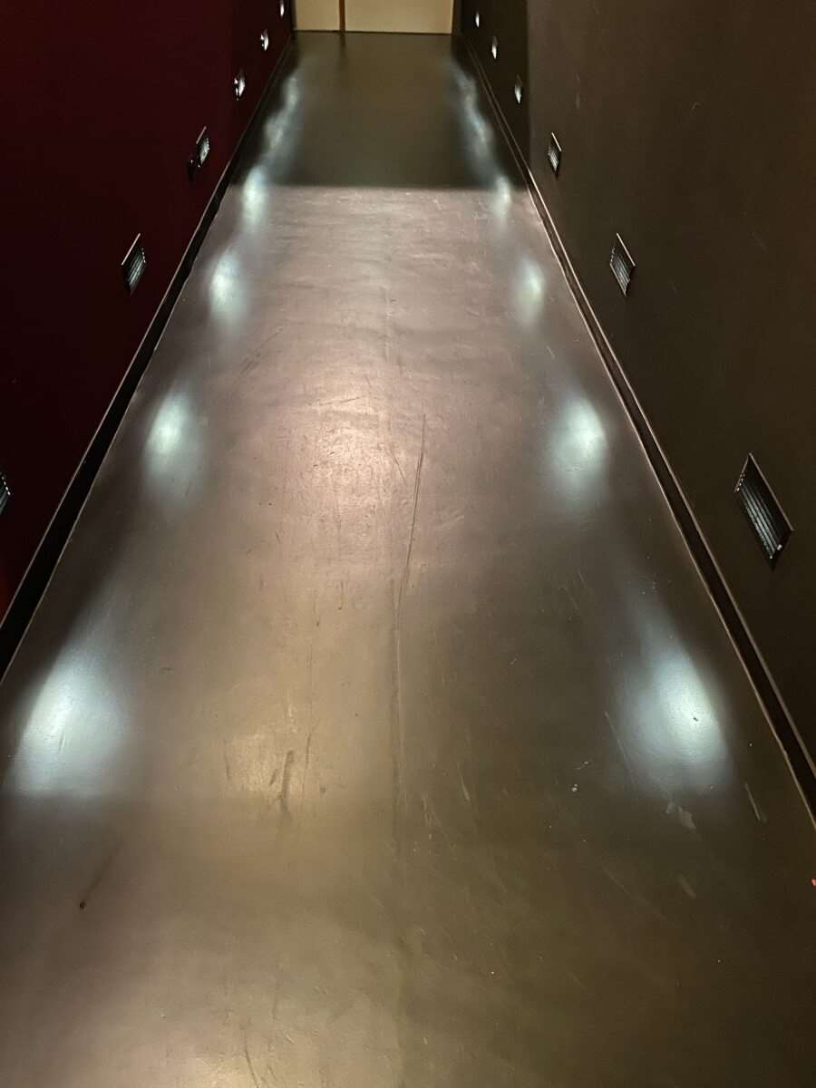 Our restoration methods were to grind out the deep gouges by hand using different grits, to key the surface so we can get a good bind on with our sealer, clean and strip the floor removing all dust leaving the floor clean, dry, and residue free, ready to be sealed.